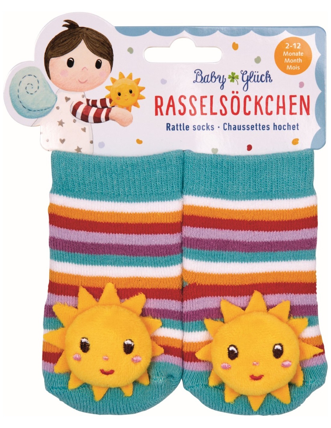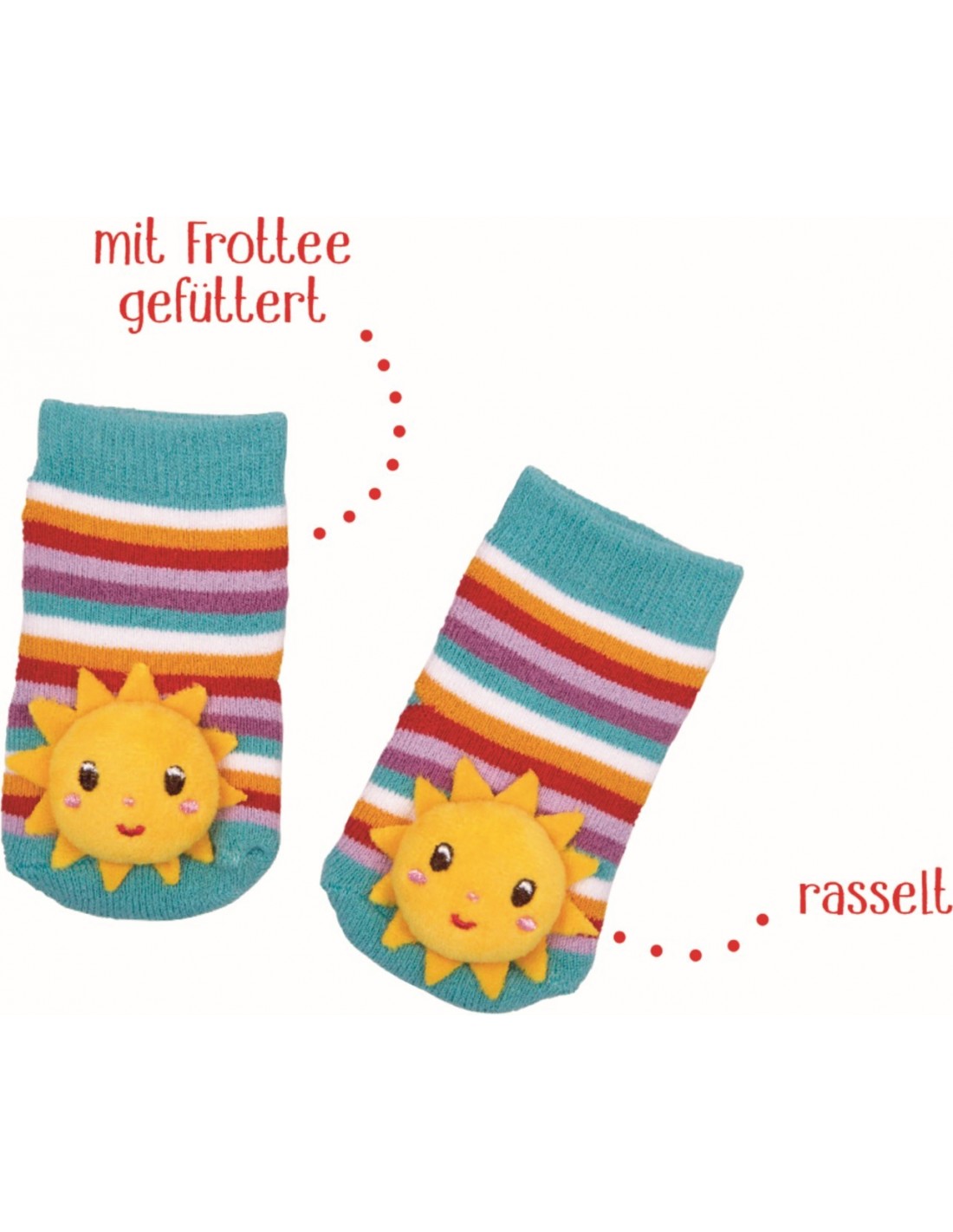 Textiel en kledingDeze kleurrijke rammelsokjes met een vrolijk zonnetje zijn gevoerd met heerlijk zachte badstof, houden kleine voetjes warm en prikkelen de nieuwsgierigheid van je baby met hun zachte rammelgeluid. Ze nodigen uit tot ontdekken en grijpen, en ondersteunen op speelse wijze de motorische ontwikkeling van je kindje. Het bijzondere ontwerp met applicaties en liefdevol borduurwerk betovert jong en oud. Bijzonder praktisch: de sokjes zijn machinewasbaar op 30 graden en daardoor snel en hygiënisch schoon.