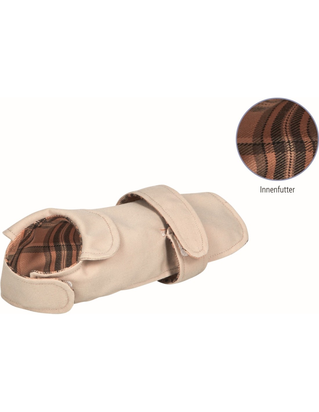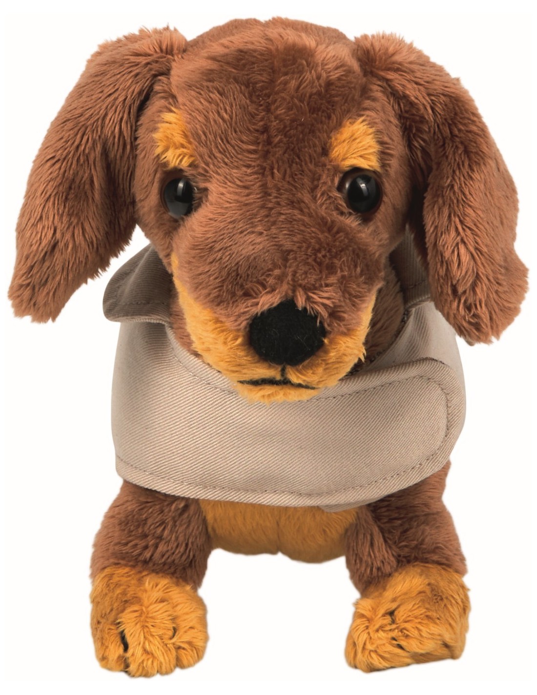 Knuffel hond met jasje met geruite voering en klittenbandsluiting.