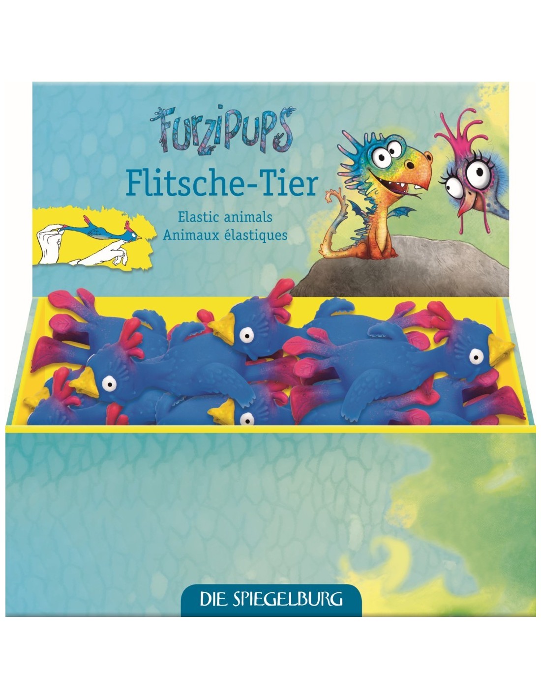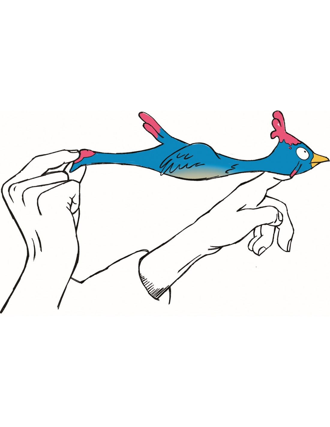 Plezier en spelletjes uit de Spiegelbug-wereld van Oepsiepoepsie (Furzipups), de knisperende draak en zijn ongewone vrienden: schuif het rubberen figuurtje van Hicksi Chicken over je vinger, rek het uit en laat het vliegen!