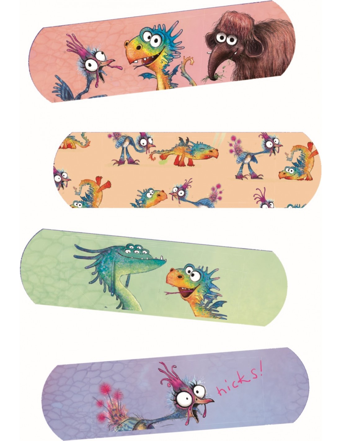 10 medische pleisterstrips met gekleurde opdruk: hypoallergeen, ademend en waterdicht, in een kleurrijk bedrukte envelop