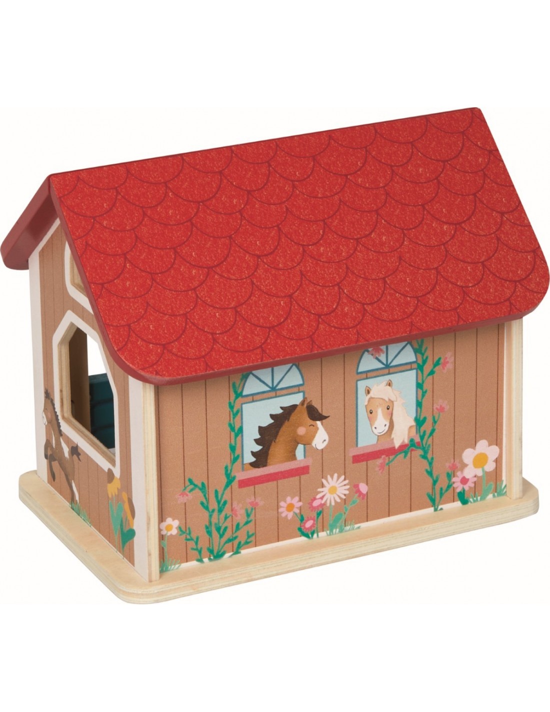 8-piece play set consisting of a stable with two hinged doors, two pony figures, a small and large hurdle, a trough, a pitchfork and a shovel