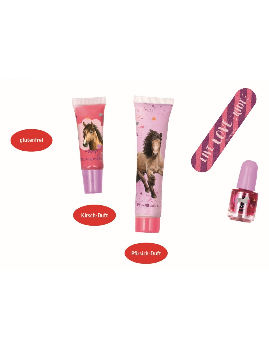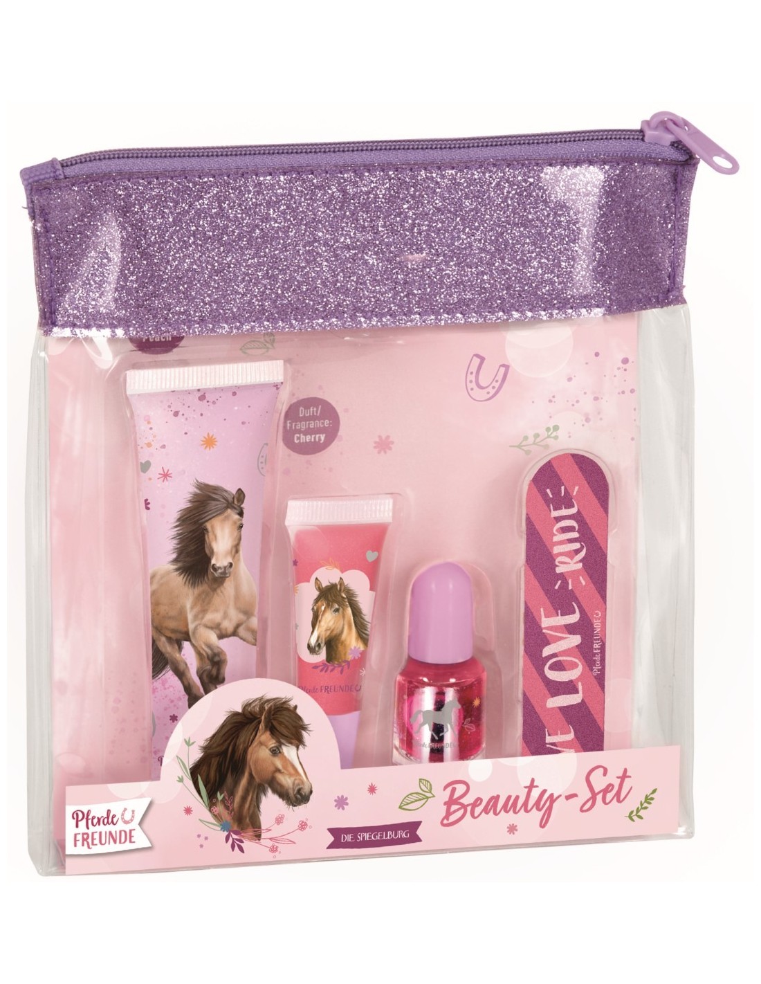 Deze betoverende beautyset voor kleine paardenliefhebbers bevat alles wat het hart van kleine ruiters sneller doet kloppen. De set van Die Spiegelburg bestaat uit een handcrème met een frisse perzikgeur, een klein nagellakje, een lipgloss met kersengeur en een praktische nagelvijl. Alle producten zijn glutenvrij en worden geleverd in een glitterend etui met rits. De beautyset met schattige paardenmotieven is ideaal om op te bergen in een ruitertas en is een echte blikvanger op elke kaptafel.