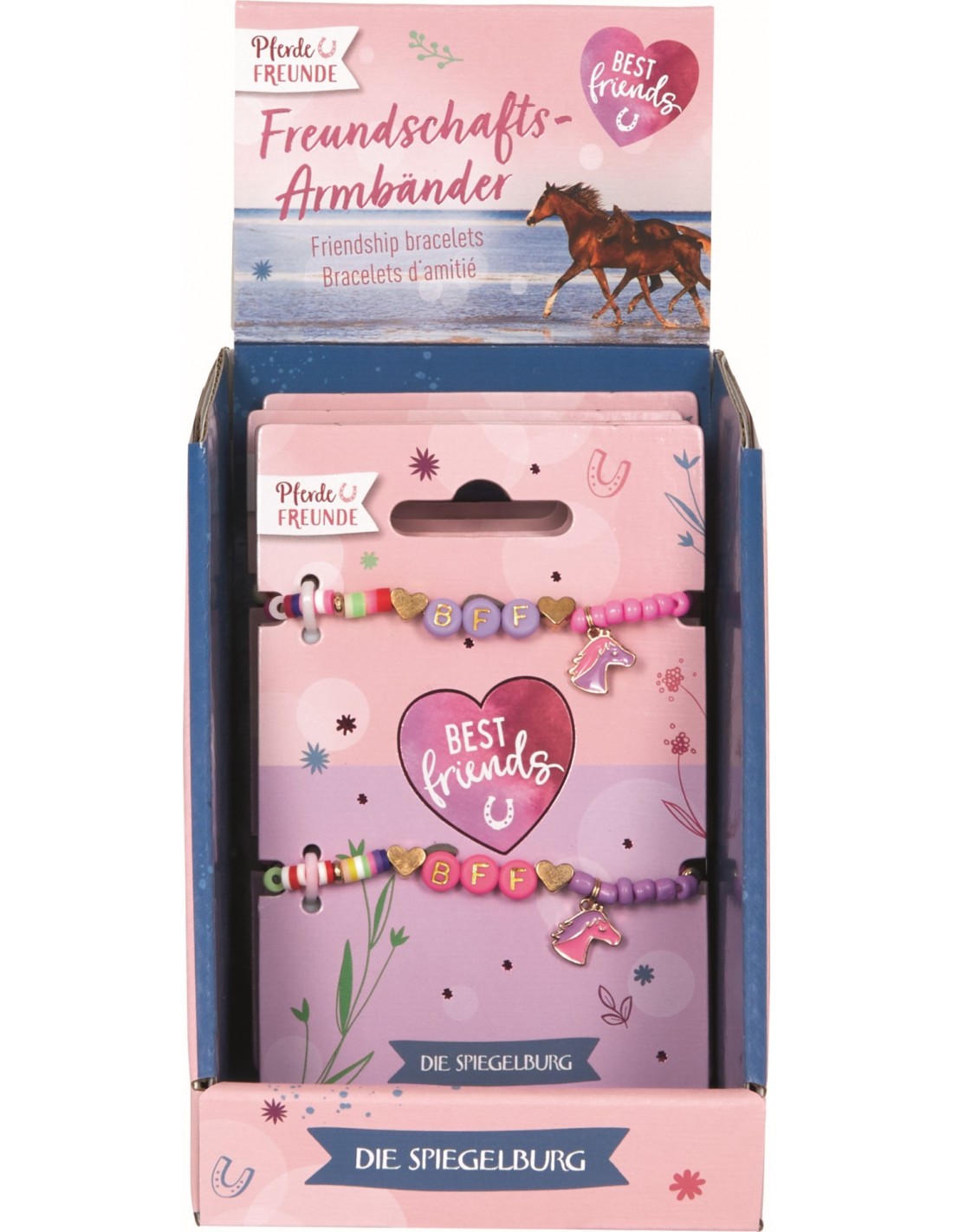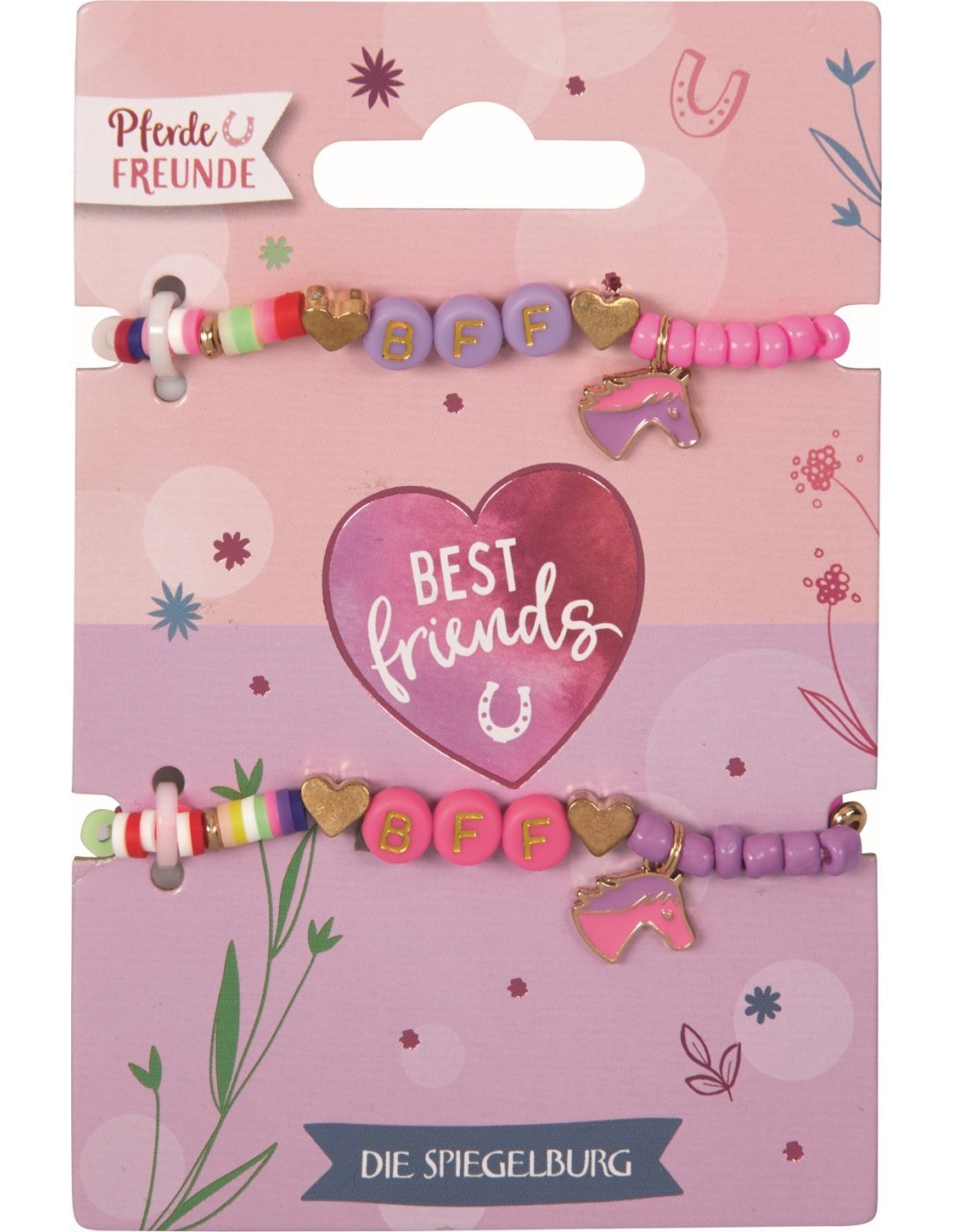 Sieraden, HaarmodeHet perfecte accessoire voor paardenliefhebbers van alle leeftijden! Deze betoverende vriendschapsarmbanden van Die Spiegelburg zijn ideaal voor echte paardenliefhebbers en hun vrienden. De set bestaat uit twee elastische armbanden versierd met kleurrijke kunststof kralen en een liefdevol vormgegeven metalen paardenhanger. Met een diameter van ongeveer 5 cm passen ze perfect om kleine polsen en zullen ze kinderogen opvrolijken. Of het nu voor een beste vriend(in) is, als cadeau of als kleine verrassing – deze armbanden laten het hart van kleine paardenliefhebbers sneller kloppen!