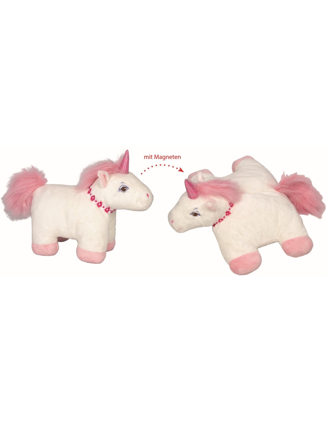 Opgevouwen is het een zacht speeltje om mee te spelen; uitgevouwen is het een zacht kussen om op te dromen / met magneten