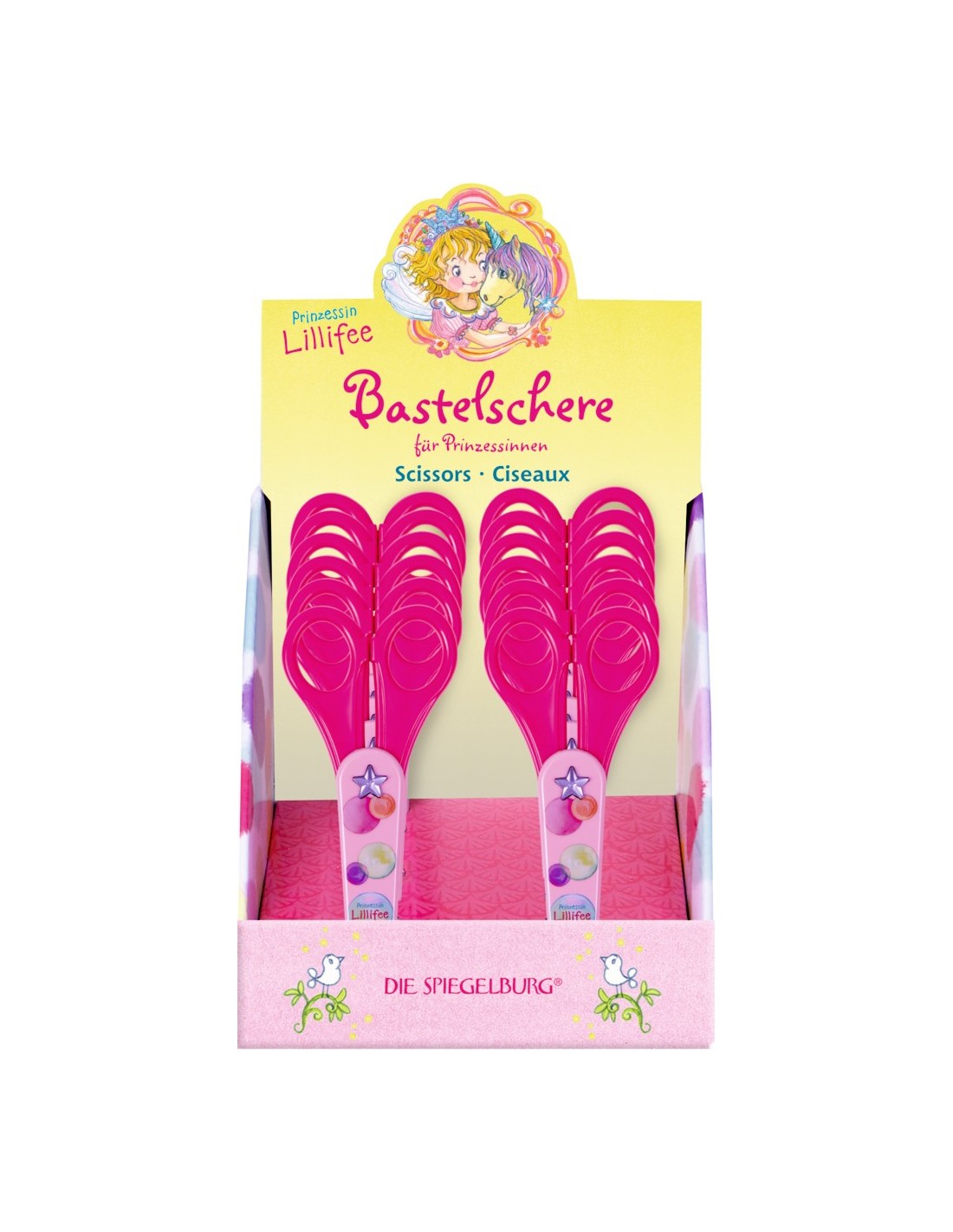 Schaar in stevige houder van prinses Lillifee met afgeronde bladen. Stevige kunststof houder met glittersteentjes. Van roestvrijstaal en kunststof. Voor rechtshandigen.