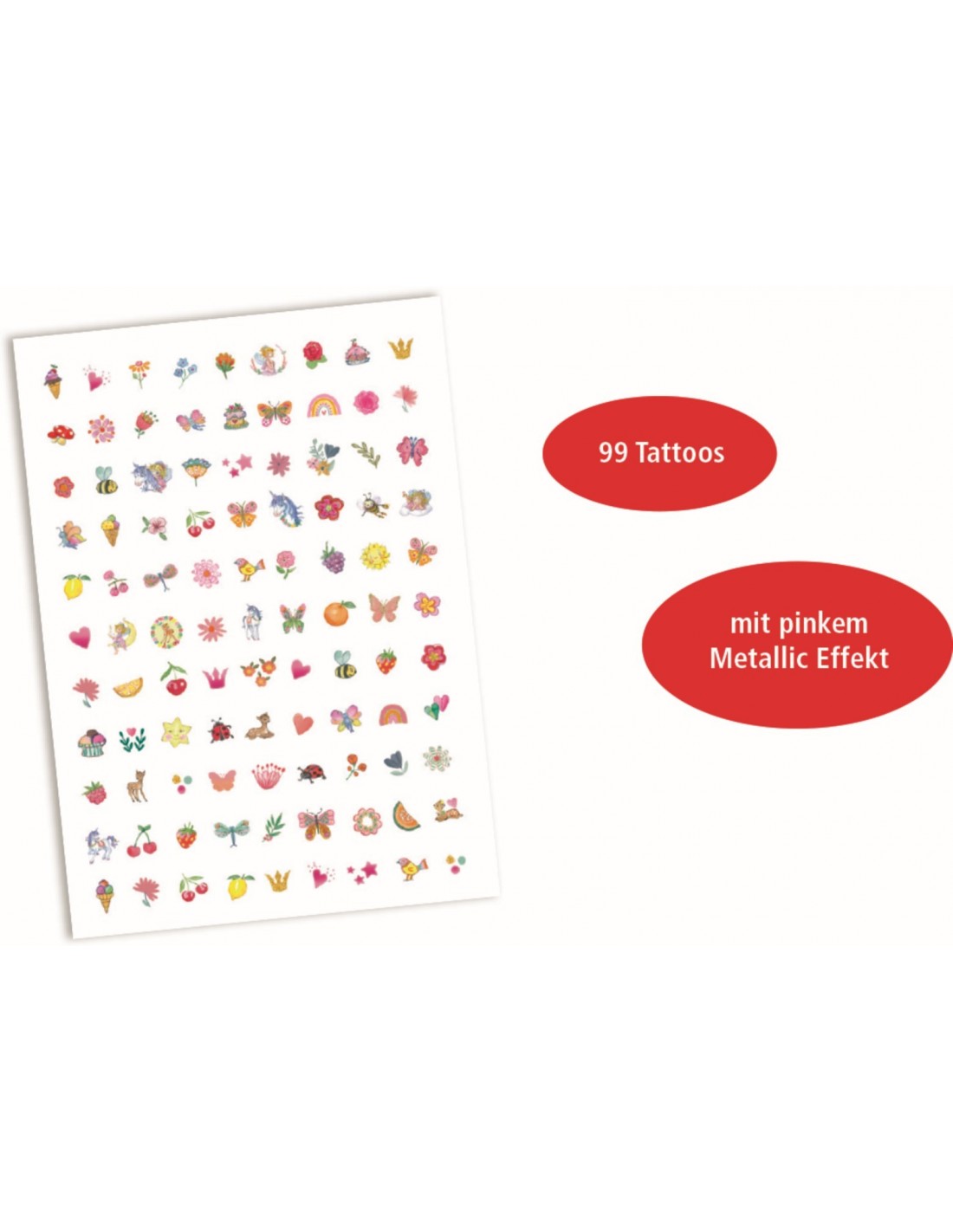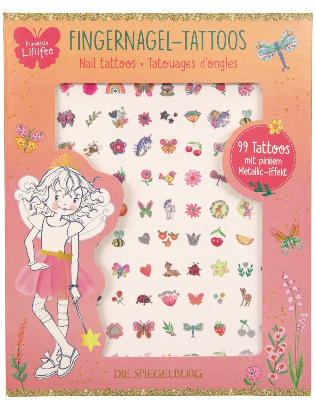 Welkom in de magische wereld van prinses Lillifee en haar vrienden: deze set van 99 huidvriendelijke nageltatoeages met schattige motieven en een roze metallic effect voegt extra glamour toe aan elke look en laat de harten van kleine prinsessen sneller kloppen. Het aanbrengen is kinderspel en de tatoeages zijn eenvoudig te verwijderen met een beetje zeep.