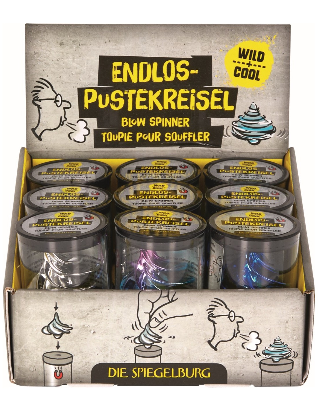 Wild + Cool: De eindeloze blaastol van Die Spiegelburg vereist behendigheid en fijne motoriek. Gebruik de verpakking eenvoudig als basis voor een draaiende tol en plaats de punt van de onderkant op de kleine magnetische uitsparing op de bodem van de verpakking - en het plezier kan beginnen! De tol kan door middel van zachtjes blazen keer op keer worden aangedreven, wat zorgt voor eindeloos speelplezier. Een praktisch speelgoed om saaie wachttijden te overbruggen of om samen plezier te hebben op het schoolplein.