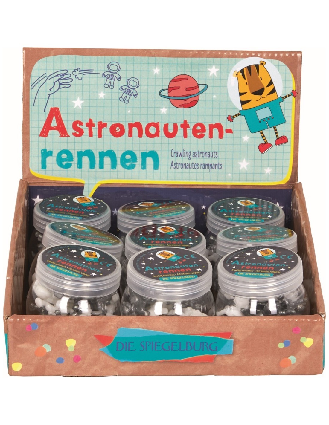 De Astronautenrace is een set van 18 astronauten in twee verschillende kleuren. Het spelidee is simpel maar spannend: elke speler laat astronauten van een specifieke kleur over een glad oppervlak van boven naar beneden kruipen, bijvoorbeeld een deur of ruit. De speler wiens astronaut als eerste de grond bereikt, wint de race! Leuk om te spelen of cadeau te doen – een ideale kleine traktatie voor in de schoen, in de adventskalender, verjaardag en feestdag.